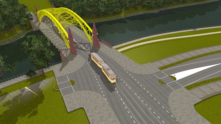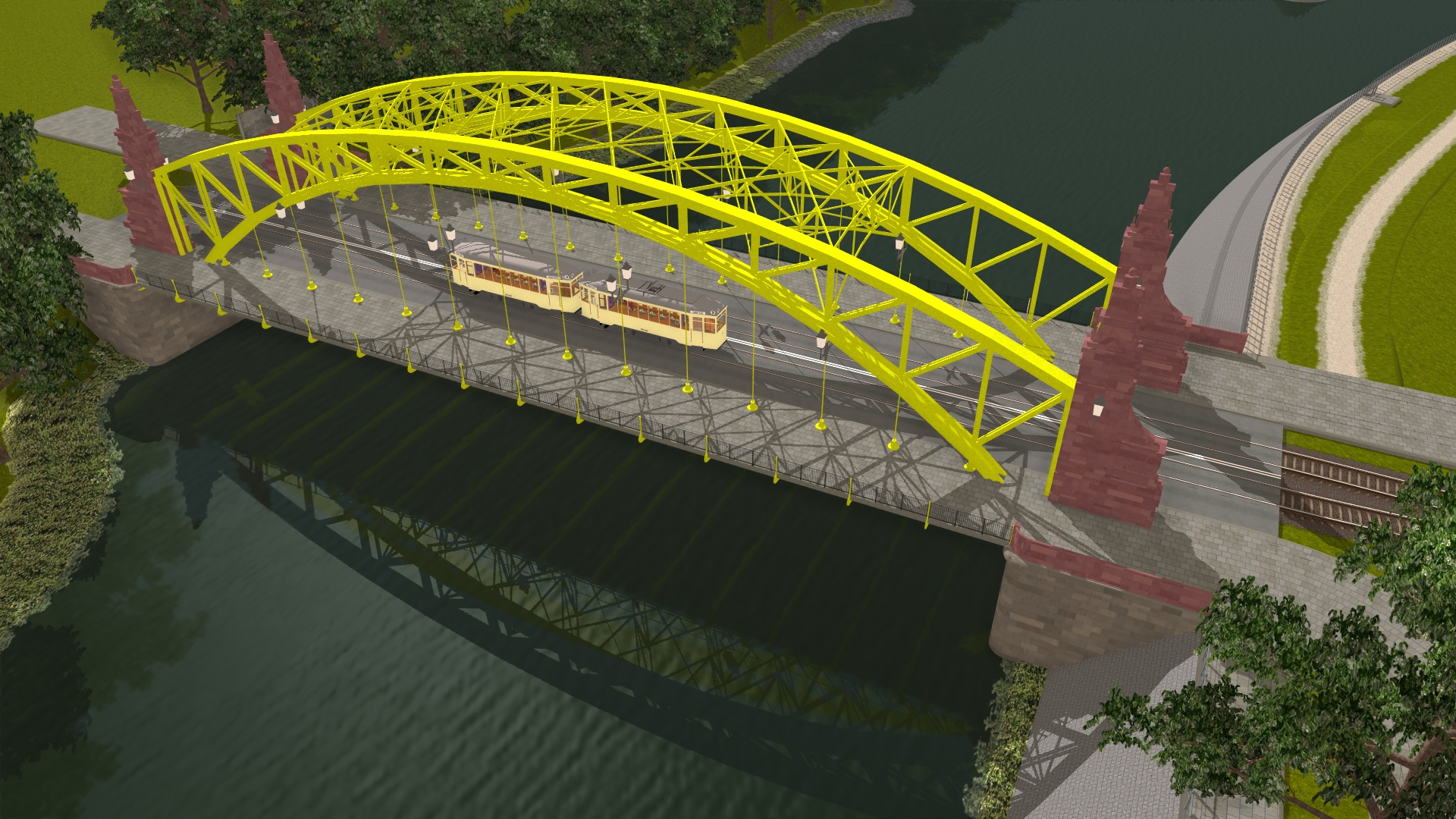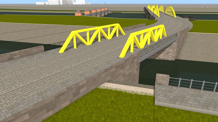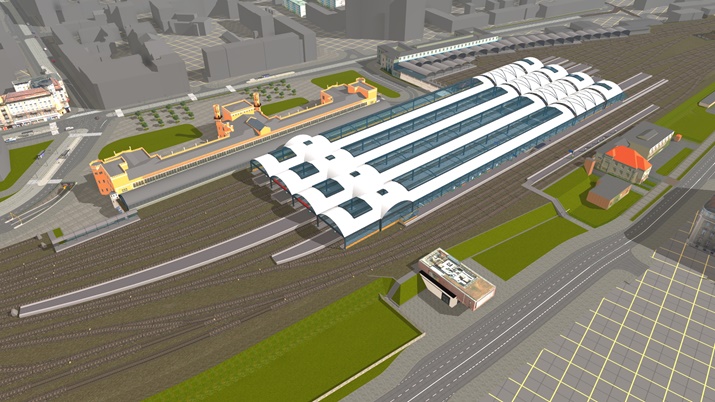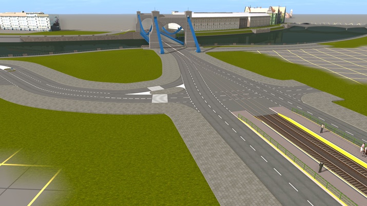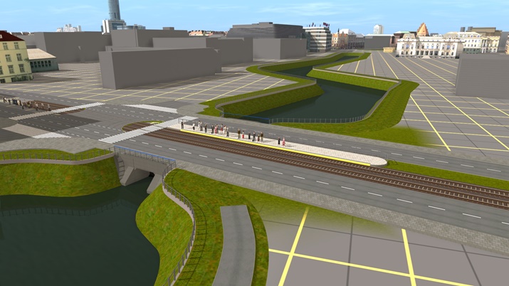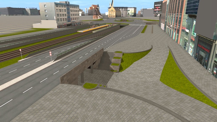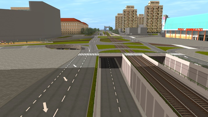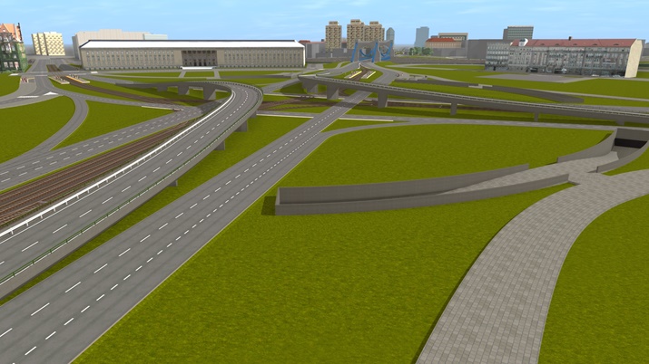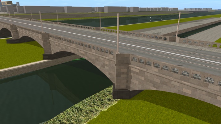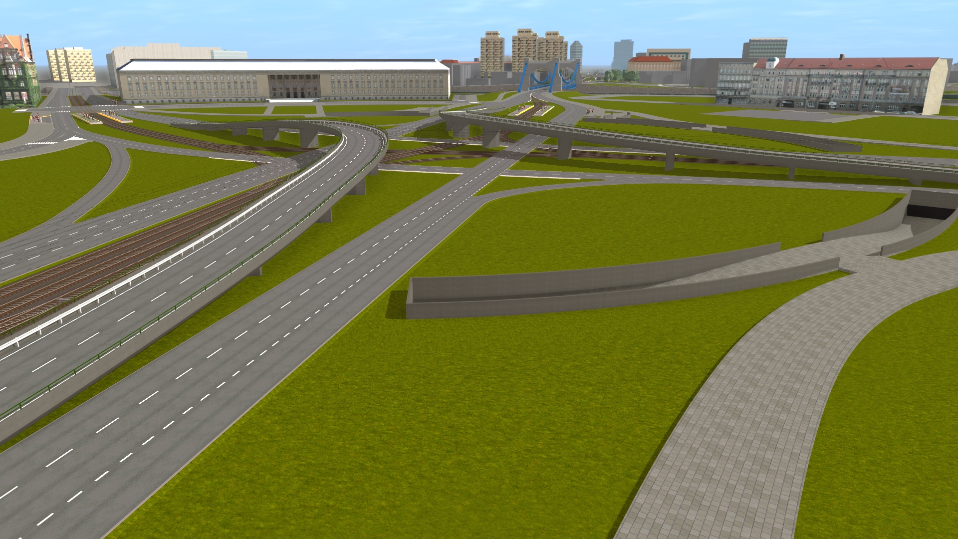 Ein sehr wichtiges Stadium ist erreicht. Es sind inzwischen alle 5 Breslauer Flüsse nachgebildet, alle Straßenbrücken über die Oder und die Ohle sowie alle Eisenbahnbrücken fertiggestellt. Alle Gebäude der Strecke stehen schon, 95 % davon müssen noch überarbeitet und texturiert werden. Nun beginne ich mit der Verlegung der Straßen, zuerst kommen die mit der Straßenbahn und Buslinien dran. Zugleich arbeite ich wieder am Breslauer Hauptbahnhof.