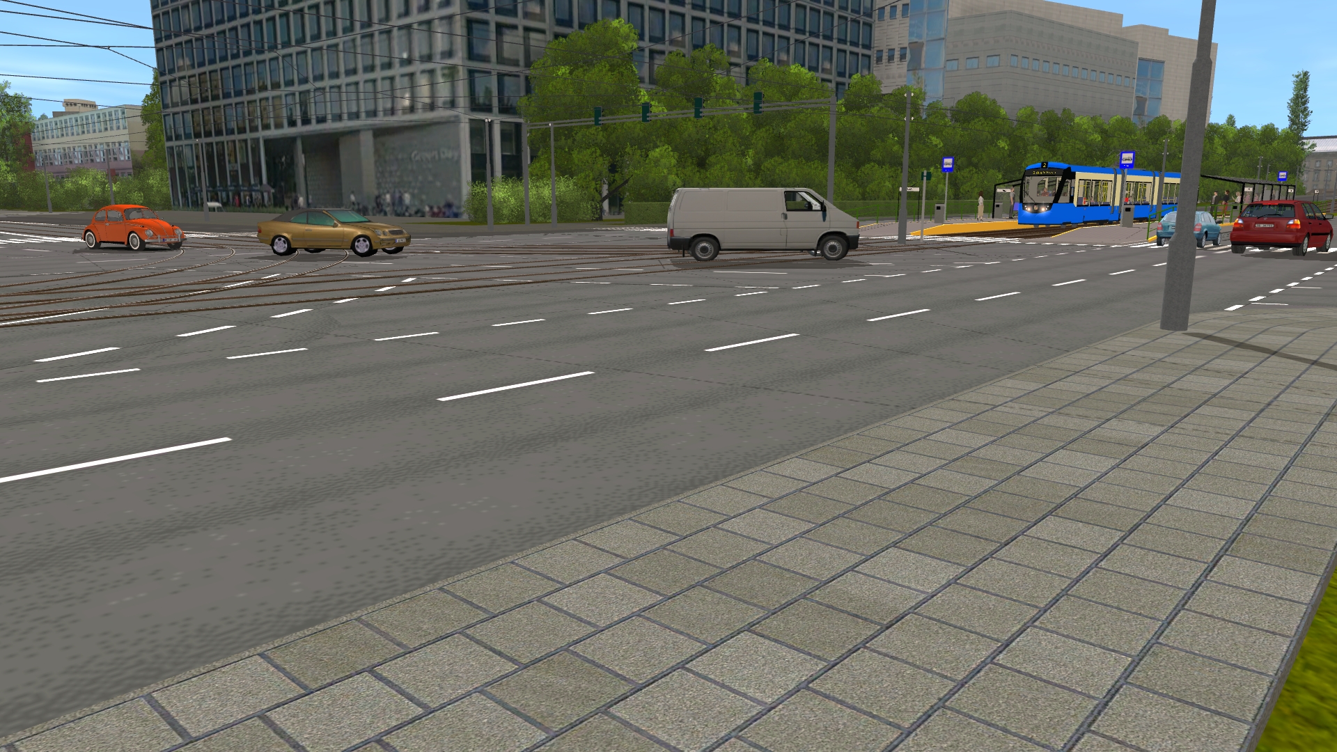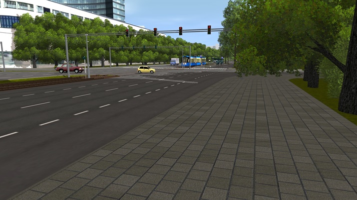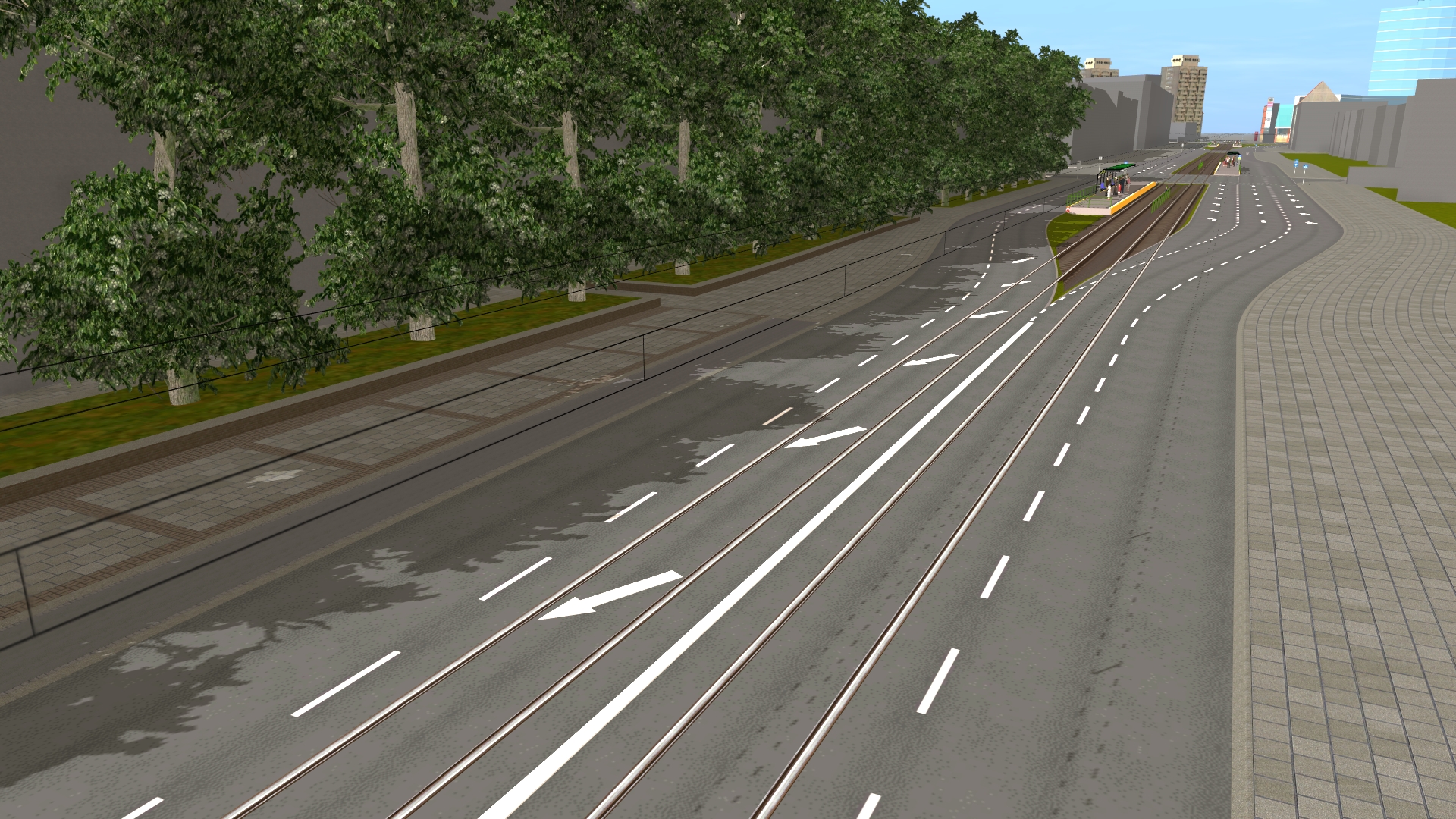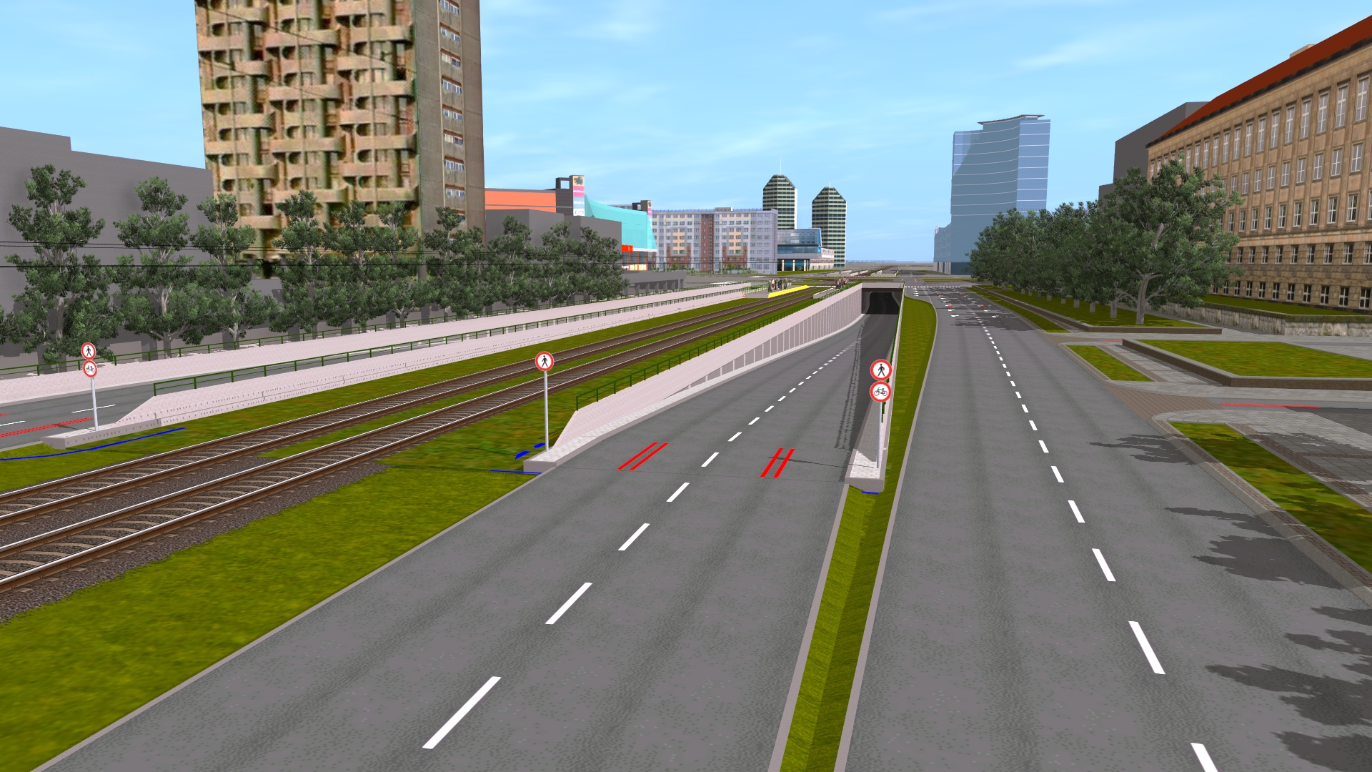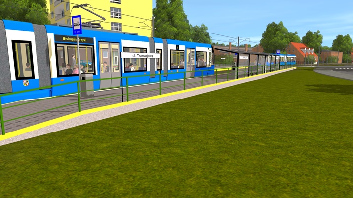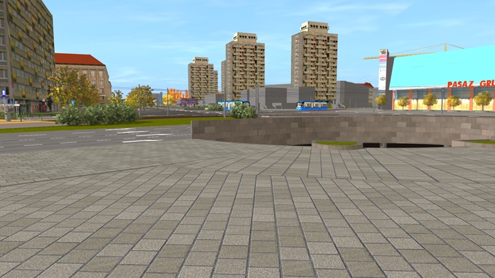 Ein Teil der Straßenbahnlinie "2" aber auch der Linie "10" zwischen "Biskupin" und "Katedra" konnte ich weitgehend fertigstellen. Die Gebäuden entlang der Gleisen sind texturiert oder nachgezeichnet. Das texturieren verläuft nicht ganz optimal, es fehlen mir die brauchbaren Fotos, da ich nicht Vorort bin, ist es nicht zu anschaffen. Wenn ich die Umgebung komplett nachzeichnen wolle, bräuchte ich ein zweites Leben um das Projekt fertig zu stellen. Neben den Gebäuden habe ich die Pflanzen, Verkehrszeichen, paar Menschen und wo es notwendig war auch Ampelanlagen, die sowohl den automatischen Straßenverkehr auch die Straßenbahnzüge steuern, eingebaut. Den Straßenverkehr habe ich mit modernen Fahrzeugen, die auch in Breslau zu erwarten sind, darunter auch einige polnische Autos, ausgestattet.