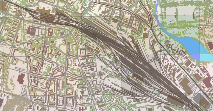 Die Fläche der Stadt habe ich mit Ausschnitten der Straßenkarte 500x500m ausgelegt. Auf dieser Basis konnte ich alle Eisenbahngleise verlegen. Zum Teil habe ich auch gleiche Quadrate als Ausschnitte der Ortfotokarte eingebaut. Das mit der Ortfotokarte werde ich seien lassen, denn es bedeutet viel Arbeit. Lieber schaue ich bei Bedarf in Google nach. Ich habe mit dem Verlegen der Straßen und Wasserläufe begonnen.