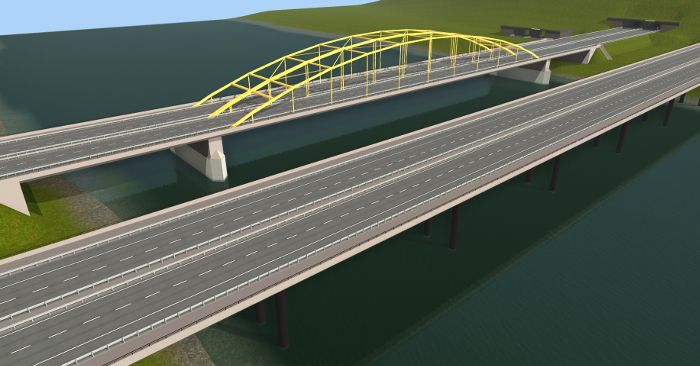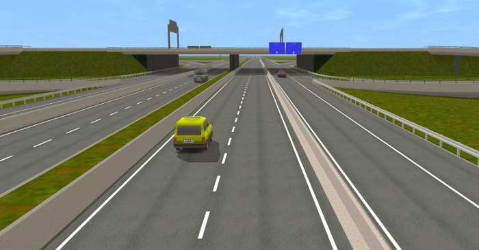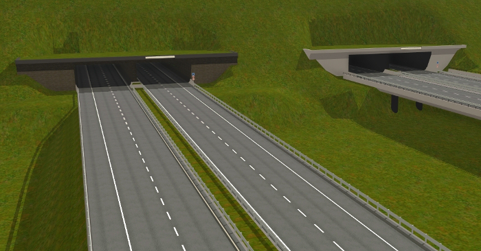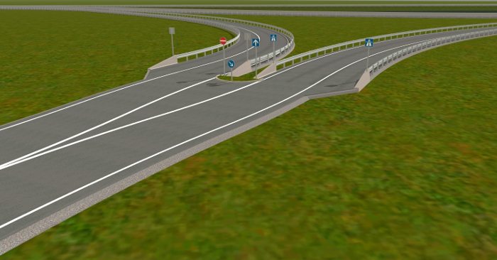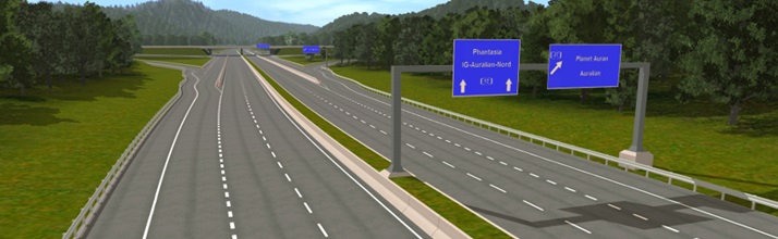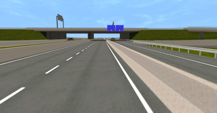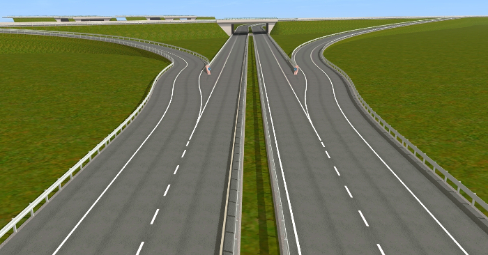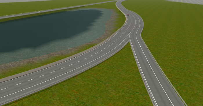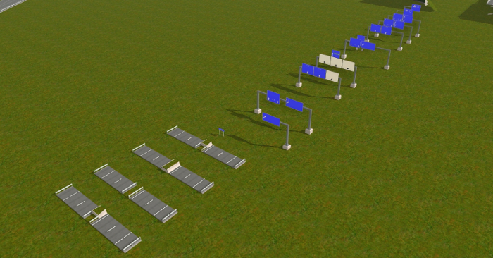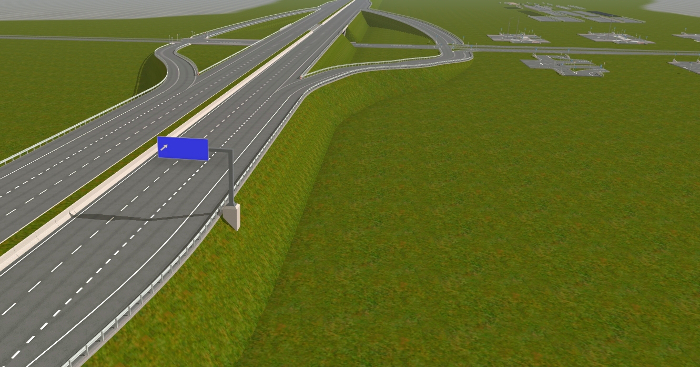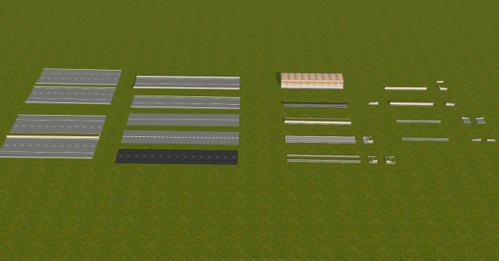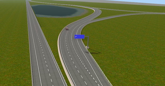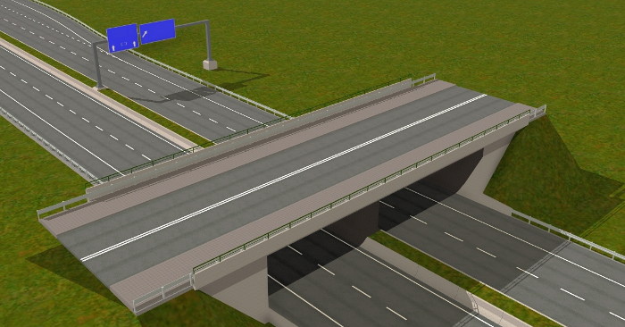 Für die Erstellung der Autobahnobjekte für das Spiel habe ich mir viel Zeit genommen. Auf meiner AWF-Strecke lasse ich über die Autobahn Busse und LKW-Transporter fahren. Daher wollte ich, dass die Straßen nicht nur nach Autobahnen aussehen sondern auch so funktionieren. Mehrere Objekte habe ich hin und wieder umprogrammieren müssen, weil sie mir nicht gefallen haben, nicht echt ausgesehen haben, oder die Fahrzeuge, die drüber gefahren sind, sich komisch verhielten. So entstand ein sehr komplexes System, der über AB-Anschlussstellen, AB-Kreuzungen, AB-Dreiecken, AB-Spur- und Fahrbahnsplitter, AB-Über- und Unterführungen für Straßen und Gleise, AB-Schilder u. v. m.