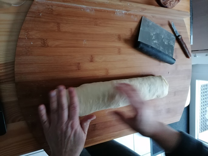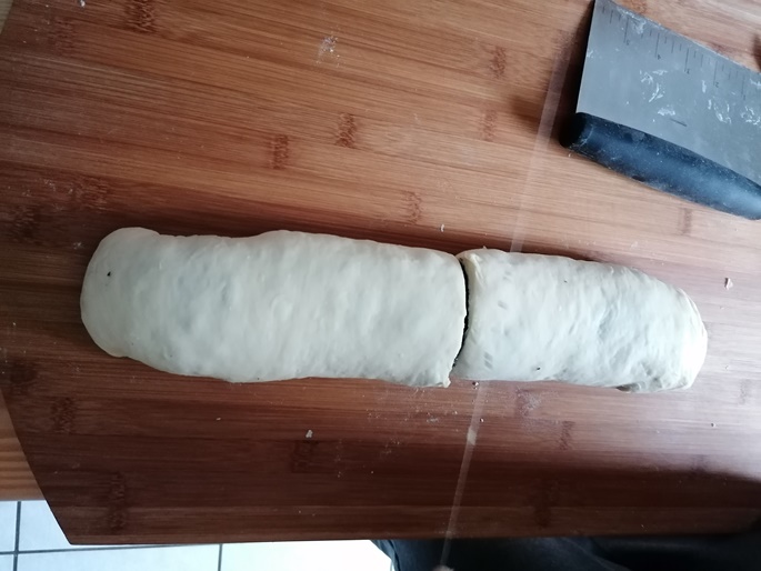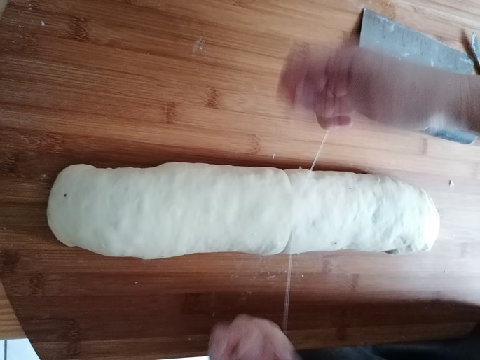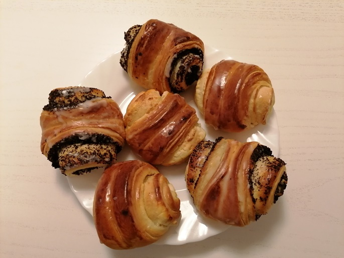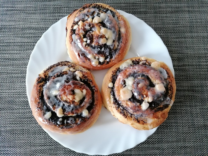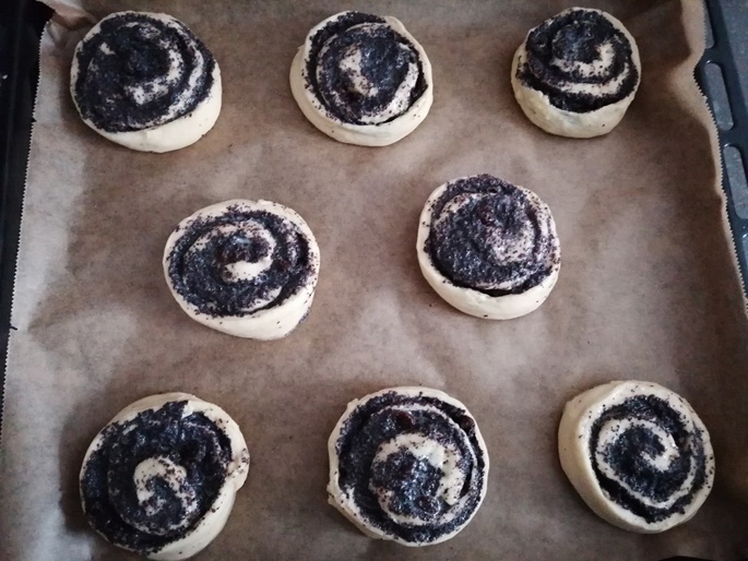 Jedną połowę ciasta rozwałkować w kształcie kwadratu na grubość 0,5 cm, posmarować masą makową i zwinąć w rulon, kroić nitką na kawałki (8 do 12 kawałków, zależnie jakiej wielkości chcemy bułki). Układać na blasze wyłożonej papierem w dużych odstępach, odstawić na godzinę do wyrośnięcia.