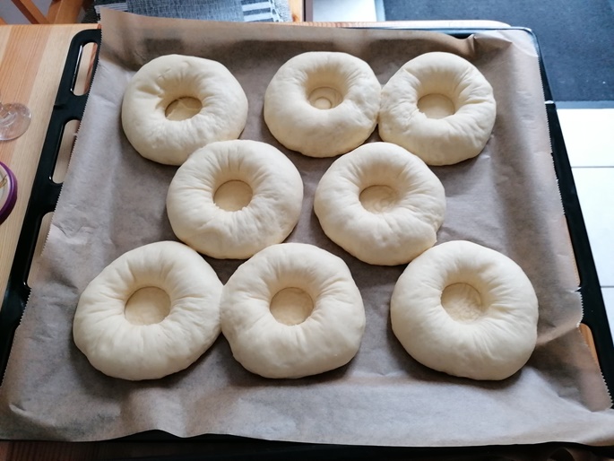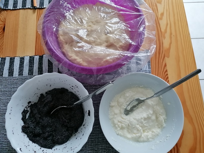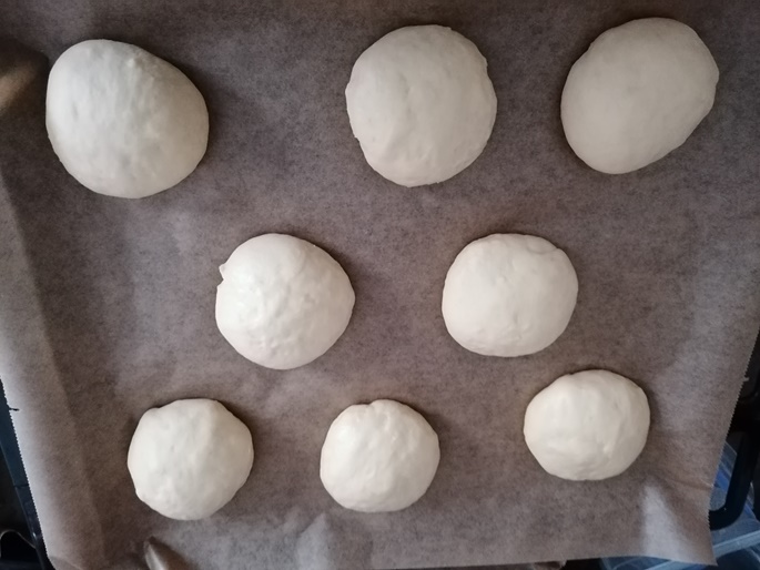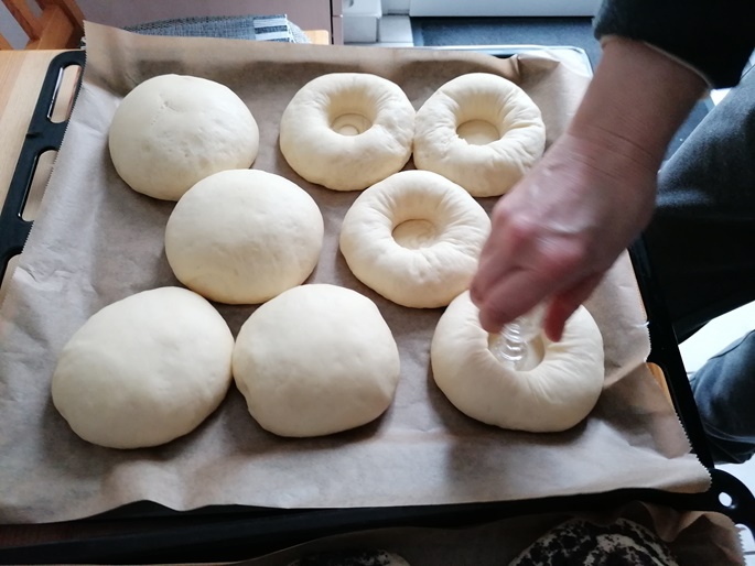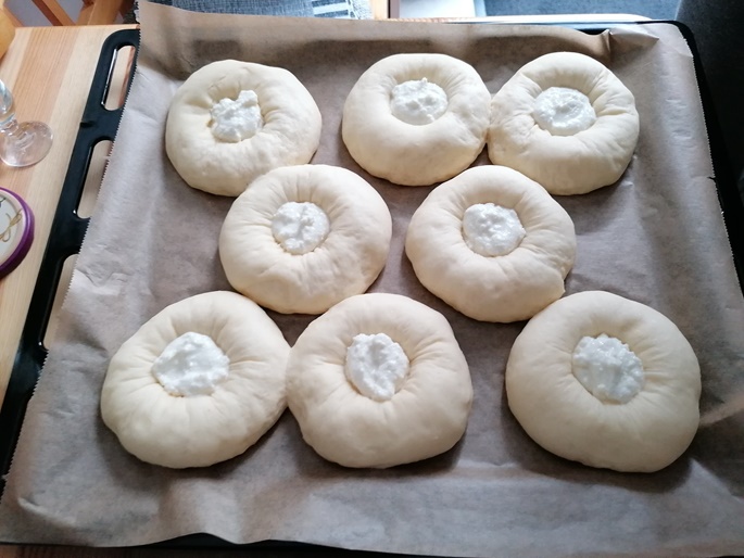 Drugą połowę ciasta uformować w rulon i podzielić na 8 do 12 kawałków (można je ważyć, by bułki były tej samej wielkości). Formować kulki, turlając je pod dłonią na stolnicy, lekko spłaszczone układać na blachę wyłożoną papierem. Po godzinie zrobić w środku zagłębienie (np. małym kieliszkiem) i wypełnić je masą serową.