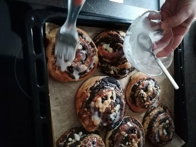 Przed włożeniem do piekarnika bułki posmarować mlekiem. Piec w temperaturze 160 stopni przez 20-25 minut, po lekkim przestudzeniu polukrować.