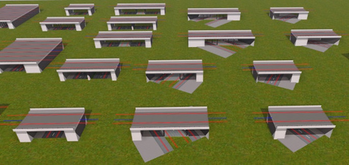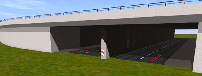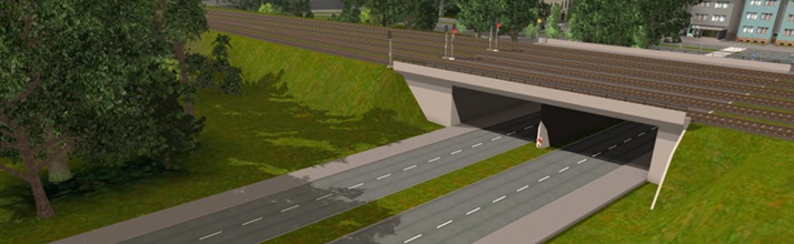 W miarę jak rozbudowywałem mój system ulic, musiałem automatycznie rozwiązać problem skrzyżowań z torami kolejowymi. Jedną możliwość wbudowałem już wcześniej z podziemnym tunelem drogowym. Inna metoda to najzwyklejszy przejazd torowy. Z tym są powiązane problemy. Sterowanie szlabanów jest bardzo trudne do zsynchronizowania z sygnalizacją torów kolejowych i toru samochodowego. Nawet jeżeli się to uda, sygnalizacje te, a testowałem kilka, są zawodne. Raz funkcjonuje a za chwilą już nie i bardzo często dochodzi na tych przejazdach do kolizji. Co prawda obydwa pojazdy poruszają się po takiej kolizji, jak gdyby nic się nie stało, sama kolizja wygląda jednak nie fajnie. Niestety sam nie potrafię napisać odpowiedniego, funkcjonującego skryptu.