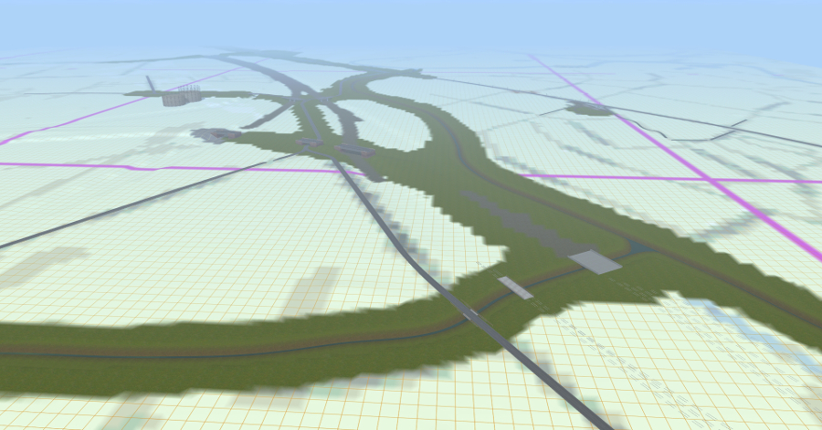 Auf dem ersten Screenshot sehen Sie ein Fragment aus der Strecke im südöstlichen Teil der Stadt. Einige Straßen und Gleise waren hier schon verlegt, auch die Wassergräben. Sie erkennen gleich die Bodentexturen, mit denen das Programm TransDEM die Straßenkarte in das Spiel übertragen hat. Ohne eine zweite Straßenkarte in der Hand und umfassenden Stadtkenntnissen ist man hier geliefert.