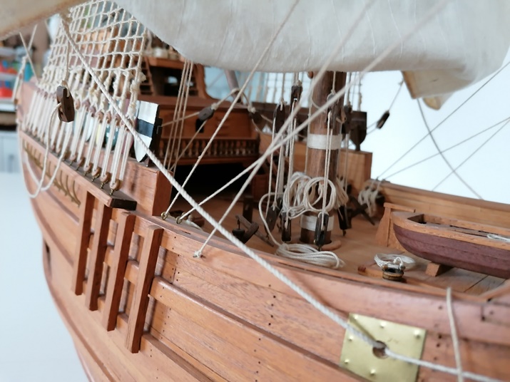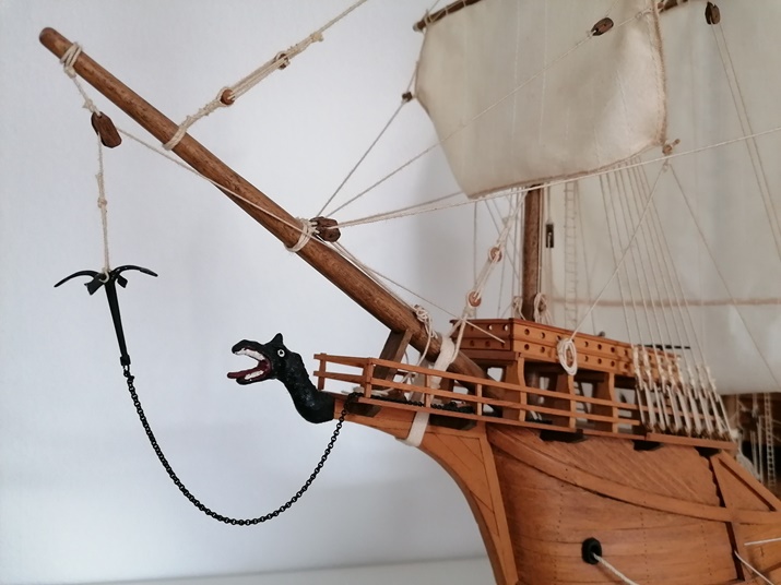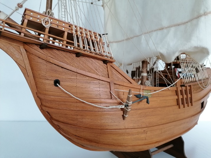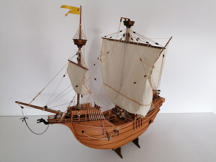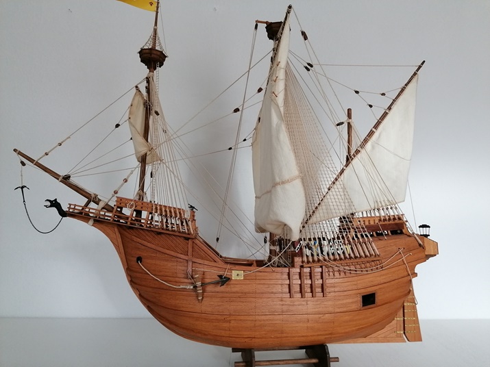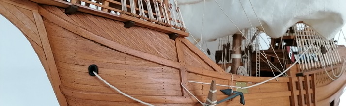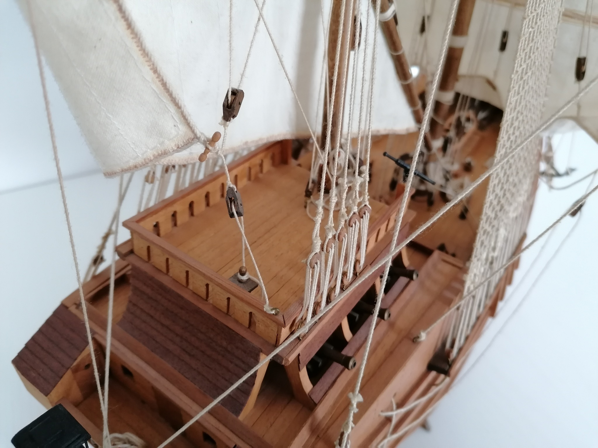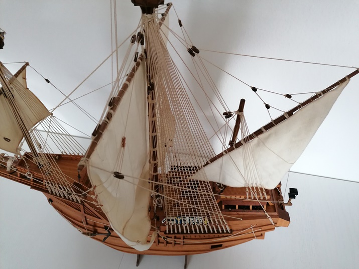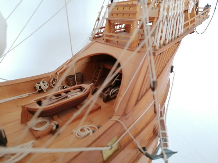 Im Jahr 1993 bekam ich einen sehr alten Plan zur Modellerrichtung von einer Karacke. Die Karacke war ein Segelschiffstyp des ausgehenden Mittelalters und der beginnenden Neuzeit. Der Schiffstyp tauchte erstmals in der ersten Hälfte des 14ten Jahrhunderts in Genua als carraca auf. Eigentlich aufgrund seiner Größe, wäre das das perfekte Schiff für Kolumbus und seine Entdeckungsreise gewesen. Ich verfüge über keine geeignete Werkstatt für solche Arbeiten, baute das Schiff in meiner damaligen Wohnung und das werde ich nie wieder auf diese Art wiederholen. Es hat gute sechs Monate gedauert bis es fertig war. Bis ich eine angemessene Werkstatt dafür habe, werde ich keine weiteren Modelle bauen.