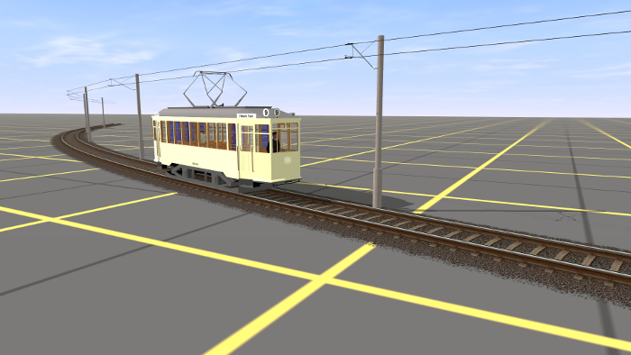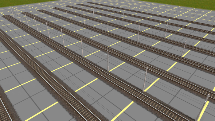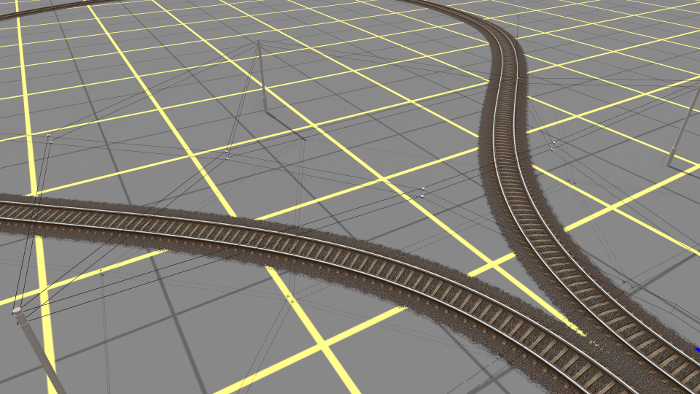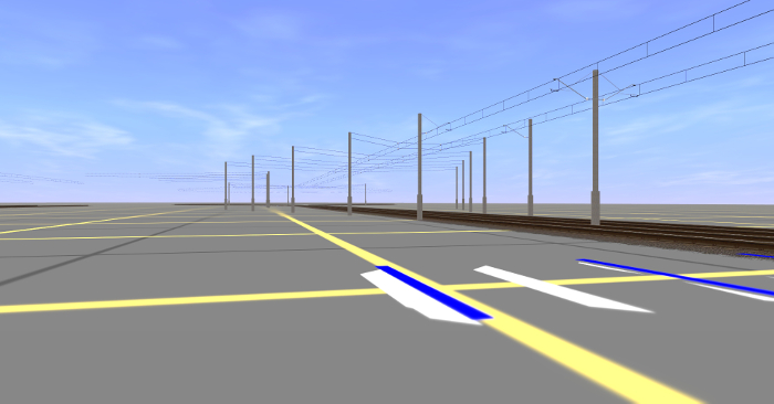 Poza zasięgiem skrzyżowań położenie trakcji elektrycznej nie sprawia większych problemów. Przy wielu torach wbudowałem słupy trakcji na stałe. Przy tym na zakrętach, choć tory idą po łuku, trakcja elektryczna przebiega od uchwytu do uchwytu w linii prostej. Wysokość trakcji elektrycznej ustawiłem na 4,85 m, to nisko, ale cząsto spotykane we Wrocławiu i w Kolonii. Właściwie życzyłbym sobie, żeby jej wysokość mogła być dowolnie regulowana, jak w rzeczywistości. Z trakcją dałoby się to zrobić, ale pantografy nie mają jeszcze takiej opcji.