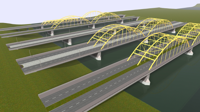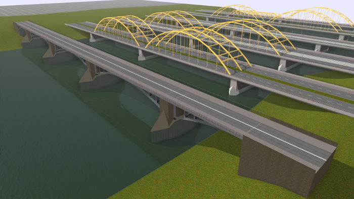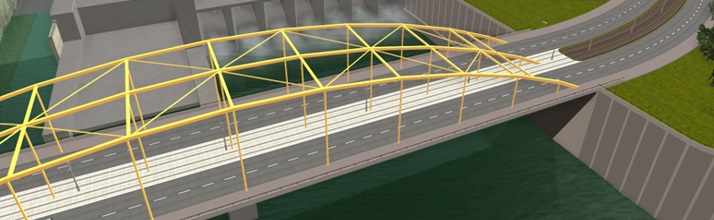 Gdzie ulice tam i mosty. Klasyczne programowanie mostu w grze Trainz jest zdecydowanie inne, aniżeli w moich obiektach. Moje mosty składają się z wielu części jak: przyczółki, podpory i różne przęsła. Tym sposobem można te części ze sobą dowolnie kombinować i dopasowywać do terenu. Ułatwia to także prowadzenie torów tramwajowych czy też niewidzialnych torów dla autobusów lub innych pojazdów drogowych. Pasy ruchu nie muszą przebiegać koniecznie obok siebie.