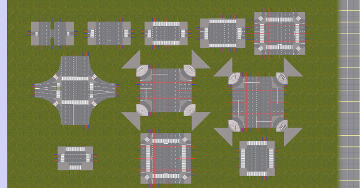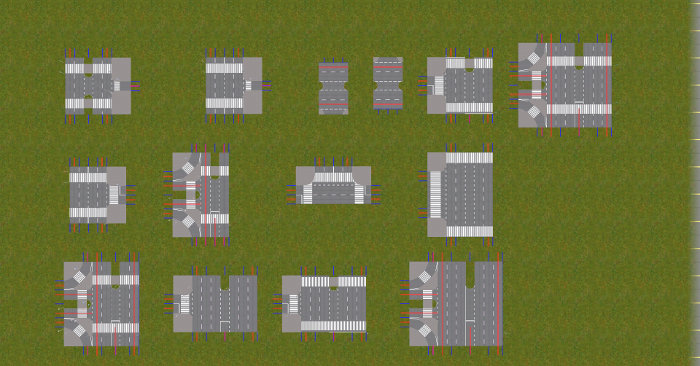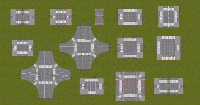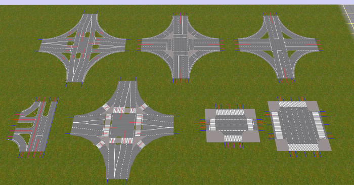 Bei den großen Kreuzungen herrschen die gleichen Regeln wie bei den Kleinen. Auch hier sind die Verkehrszeichen am Platz und alle Teile passen zueinander. Bei einigen der Kreuzungen gibt es keine Zebras, die Fußgänger werden unterirdisch geleitet. Sieht nur gut aus, wenn man an Stelle der Eingänge die Oberfläche mit einer oder mehreren Dighole durchbricht.
