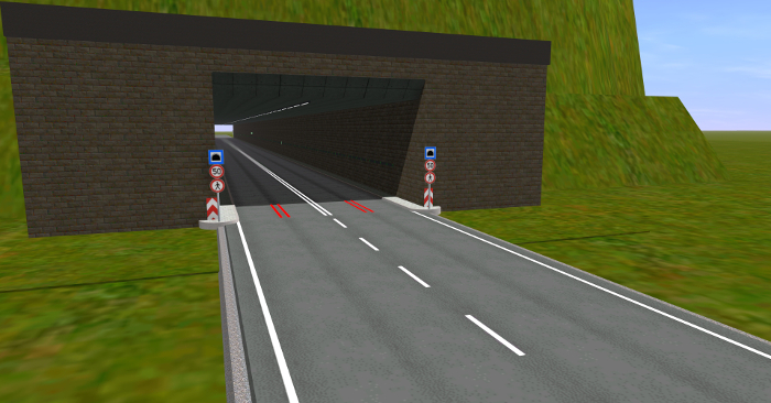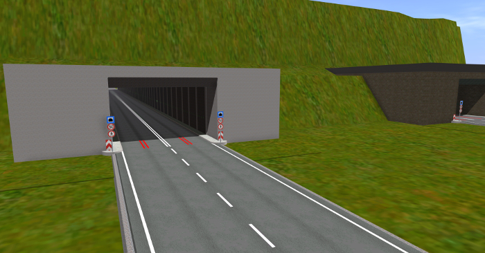 Auf die gleiche Art wie die Eisenbahntunnel werden Straßentunnel erstellt. Die Eingänge sind mit Verkehrszeichen versehen und die Tunnelrohre haben eingebaute Notausgänge.